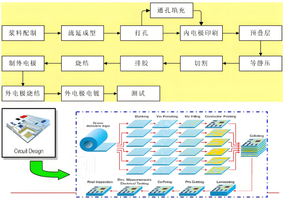 O processo principal deLTCCA tecnologia é a seguinte: Primeiro, pó de cerâmica, pó de vidro e ligantes orgânicos são misturados e depois processados em fitas de cerâmica verde com espessura precisa e estrutura densa através da fundição, secagem e outros processos. Posteriormente, os padrões de circuito necessários são fabricados nas fitas de cerâmica verde usando tecnologias como perfuração a laser, rejunte de micro-orifícios e impressão de pasta de condutores de precisão. Em seguida, várias fitas de cerâmica verde processada são laminadas e integradas e sinterizadas em um ambiente de baixa temperatura abaixo de 900 ° C. Finalmente, os dispositivos de chip podem ser produzidos; Ele também pode incorporar vários componentes passivos para formar um único substrato tridimensional de circuito de multicamadas de cerâmica; Além disso, os ICs e dispositivos ativos podem ser montados em sua superfície para criar módulos funcionais passivos/ativos integrados. Essa tecnologia pode promover ainda mais a miniaturização e a alta densificação de circuitos e é particularmente adequada para a fabricação de componentes no campo de comunicação de alta frequência.